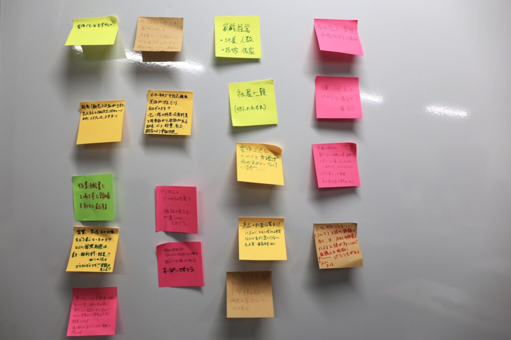 その後配布した付せんとペンを使い、参加者が自社の事例を記入していきます。書き終えたらマイクを回し、一人一人発表してくれました。発表後に付せんを回収して一か所に集約、そこから何となくグルーピングを図ってみたい狙いです。 発言の口火を切ってくれたのは、われらが木原チェアマン。製版会社なので印刷会社のような計算式にはなりませんと前置きして、次のように取りまとめました。